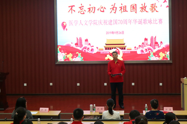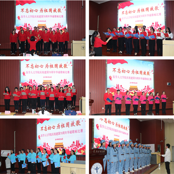 学院党委书记王明滨同志致辞 作为第二批参加“不忘初心、牢记使命”主题教育的单位,在国庆前夕,以歌声铭记历史,牢记初心,用歌咏比赛的形式表达浓浓的爱国主义情怀。全院师生以支部和工会小组为单位组成六支参赛队,在前期的精心准备下,大家各显其能、各具特色,用饱满的激情和嘹亮的歌声共同歌唱伟大祖国。《游击队之歌》、《闪闪的红星》、《绒花》、《东方红》一首首经典红色歌曲勾起了师生们对中国革命峥嵘岁月的回忆;《黄河大合唱》、《团结就是力量》、《年轻的朋友来相会》、《爱国奉献歌》一首首慷慨激昂的歌曲激励着师生们奋发向上;《歌唱祖国》、《我爱北京天安门》、《爱我中华》一首首歌颂祖国的歌曲让师生们为伟大的祖国感到骄傲与自豪;”是以华夏,是以中国,是以传承,是以辉煌”,诗歌朗诵《何以华夏,何以中国》展现了中华文明的源远流长,让全院师生共同经历了一次爱国主义洗礼。载着对祖国的祝福和热爱,老师与同学们服装整齐,精神昂扬,比赛中各个队伍都拿出了自己最闪亮的一面。经过激烈的角逐,研究生与本科生合唱队获得一等奖,应用语言学系合唱队、医学心理学系和医学伦理史学系合唱队获得二等奖,应用体育学系合唱队、行政教辅合唱队、卫生法学系师生合唱队获得三等奖。