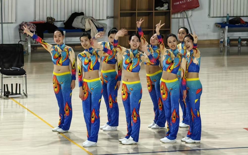 健身舞蹈规定动作运动量颇大,是技术与体力的双重挑战。赛场上十名队员拼尽全力挥洒汗水,场外教练和队友们齐声助威,将每一个动作做到极致,完美发挥,以8.366分的成绩最终获得了季军。 民族健身操比赛,共八位运动员参加,其中有七位兼项队员。纵然之前的项目已经消耗了大部分队员较多的体力,但八位队员在赛场上依旧保持了高水平的竞技状态,超高的动作同步率,一举以8.633的高分拿下了亚军。
