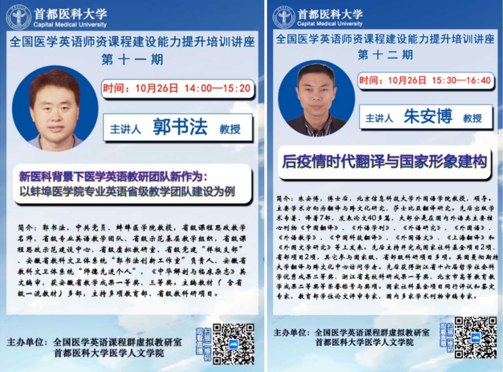 10月26日下午,全国医学英语课程群虚拟教研室在线举办全国医学英语师资课程建设能力提升培训第十一期和第十二期讲座。看漫画 院长卢凤香教授主持讲座。