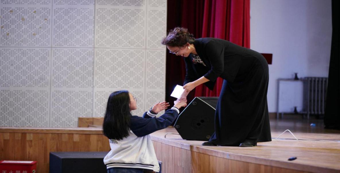 汪莉将出版的唱片赠送给提问回答正确的同学 讲座互动环节中,三位嘉宾为同学们耐心答疑。汪莉教授将出版的唱片作为礼物赠送给提问同学。三位老师对首医学子善于思考、敏于求知的精神表示了高度赞赏。