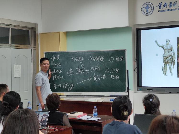 学系副主任谷晓阳老师主持活动,表示作为一线的基层教师,能做的就是把教学搞好、科研搞好,并对参与活动的讲座嘉宾和对谈嘉宾依次进行了相关介绍。孙轶飞老师从1543年出版的第一部解剖学教材《人体的构造》引入,围绕其作者维萨里展开分享,首先介绍了维萨里的生平,将与之有联系的人物关系图进行了现场板书,向我们解释了维萨里人生发展中种种看似不合理的谜团。其次,展示了《人体的构造》著作中“肌肉人组图”与现今解剖教材中人体插图的不同,并对“医生家族”与佛罗伦萨文艺复兴进行了阐述。最后,介绍了《人体的构造》中所有图画结构都是按照比例绘制,且最终可以上色并拼接成一整副解剖图。肌肉人组图中,人体的完整程度与背景建筑的完整或破败形式也是对应的。孙老师以风趣幽默的方式让我们明白解剖学不仅仅是枯燥的知识,而是医学与艺术之间的奇妙相遇。分享结束,三位对谈嘉宾分别进行了现场互动,在场的其他老师和同学也与孙老师展开了激烈的讨论交流。