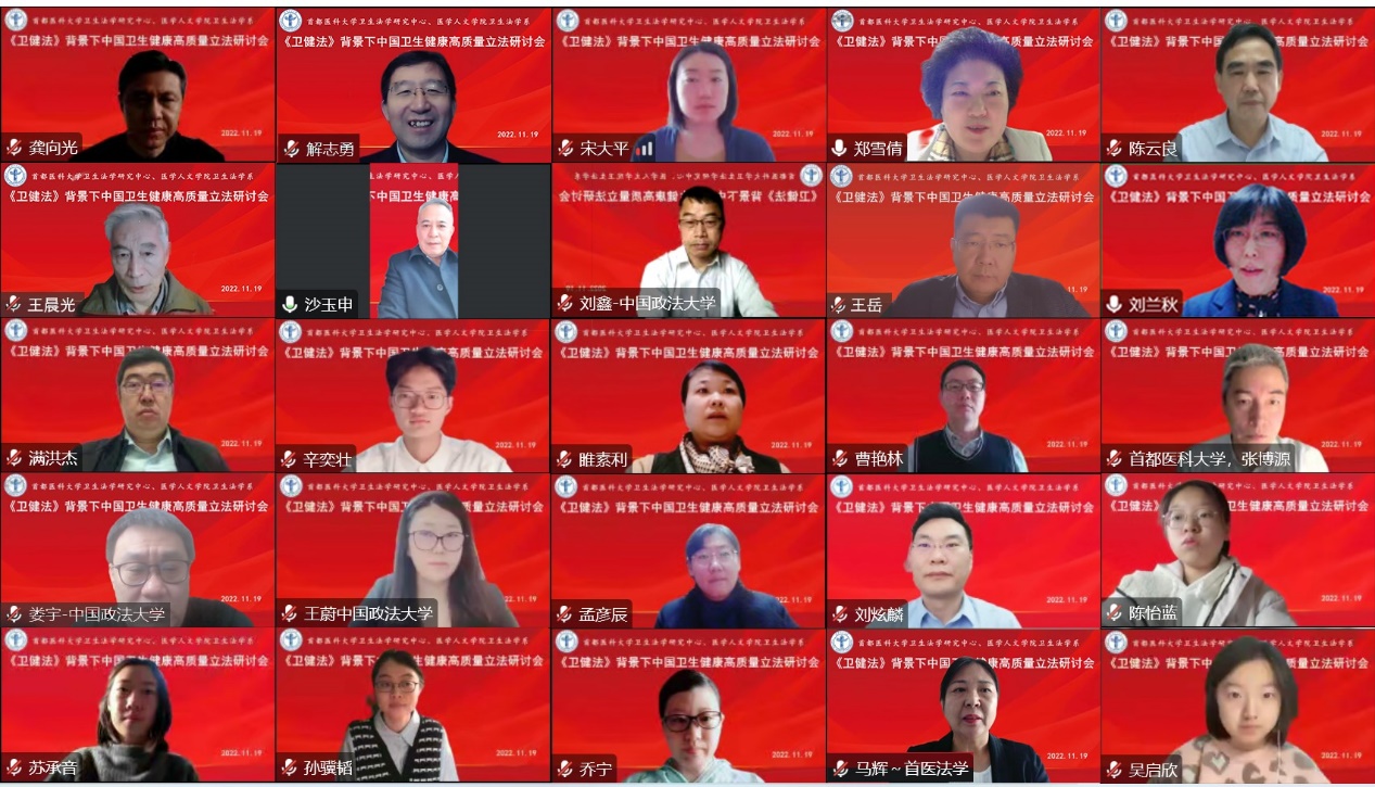党的二十大报告强调坚持全面依法治国,推进法治中国建设,强调把保障人民健康发展优先发展的战略位置。推进卫生健康领域的立法进程,实现卫生健康立法的系统性科学性,精细化,对于实现卫生健康事业的中国式现代化至关重要。2022年11月19日上午,由看漫画 卫生法学研究中心和看漫画 卫生法学系主办的“《卫健法》背景下中国卫生健康高质量立法”研讨会顺利举行。来自国家卫生健康委员会、中国卫生法学会、清华大学、北京大学、中国政法大学、华东政法大学、广东外语外贸大学、北京协和医学院、看漫画 、中国医学科学院医学信息研究所、国家卫生健康委卫生发展研究中心、北京市华卫律师事务所的近二十位专家学者齐聚云端,围绕《基本医疗卫生与健康促进法》颁行后中国卫生健康立法的模式与内容展开热烈研讨。