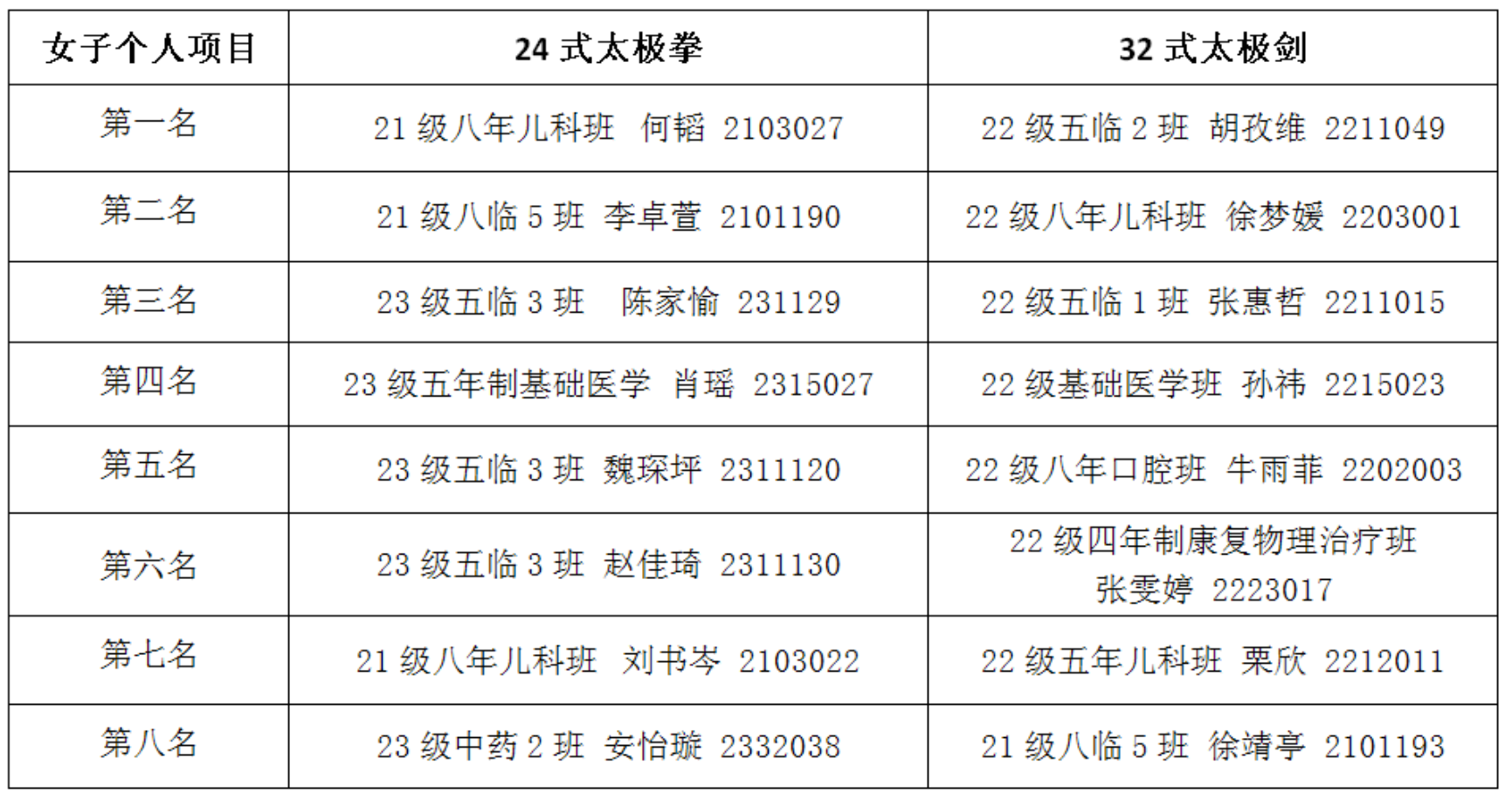 2023年11月27、30日,由校体育运动委员会主办,应用体育学学系承办的看漫画 太极拳(剑)比赛在看漫画 体育馆一层顺利举办。本次大赛面向看漫画 右安门校区学生,以班级为单位报名,分为集体项目和个人项目两大环节,包括24式太极拳、32式太极剑,为学生们提供了一个展现自身实力和交流技艺的平台。比赛吸引了97名学生报名个人项目,17个班级共138名学生报名集体项目,展现出同学们对太极拳(剑)赛事的热情。