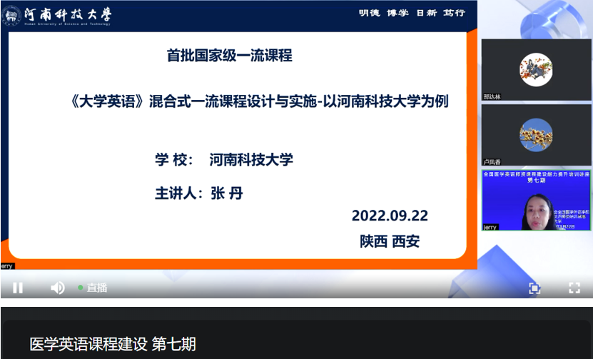 河南科技大学外国语学院张丹教授做讲座 卢凤香教授在总结中希望广大一线医学英语教师认真总结借鉴其他高校英语课程建设的成功经验。在工作中既要埋头苦干,也要抬头看路,要全面透彻精准学习和捕捉国家教育政策导向,使课程建设与时代发展、学校发展、学科人才培养要求相契合;课程建设不可能一蹴而就,必须排除功利性、循序渐进持之以恒地不懈努力,课程建设也不可能是个别老师单枪匹马的战斗,必须依靠团队的管理引领、团队成员的沟通互补与团结协作;外语教学的课程思政建设必须久久为功、落在实处,与教学内容、教材编写、专业特色等巧妙结合,强调其适切性;高校教师不能仅满足于做一名教书匠,必须注意教研结合、教研并进互哺,做教学的有心人,以研促教。