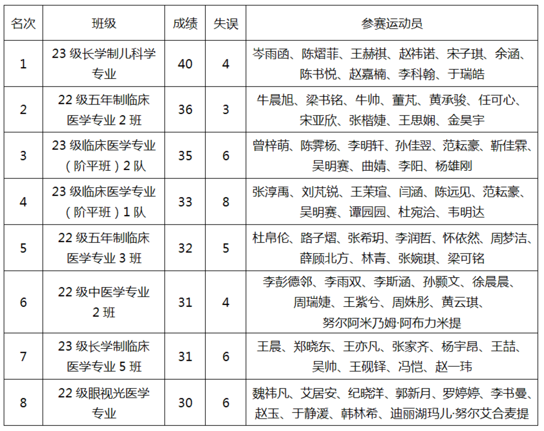 5月15日,校本部的操场上骄阳似火,人声鼎沸。比赛瞬间展开,精彩纷呈。各班选手都充满了斗志和热情。他们是对手亦是朋友,随处可见的是同学们在赛场上互相激励,为自己及班级争取荣誉。他们全心地投入到比赛中,尽全力展现出自己的技巧和速度,不断挑战自己的极限。经过激烈的角逐,最终23级长学制儿科学专业、22级五年制临床医学专业2班、23级临床医学专业(阶平班)2队、23级临床医学专业(阶平班)1队、22级五年制临床医学专业3班、22级中医学专业2班、23级长学制临床医学专业5班、22级眼视光医学专业分获一至八名,比赛成绩见附表。 首医学子们不仅在专业课程中表现出色,在体育比赛中也展现了勇往直前、奋力拼搏的精神。体育比赛不仅是锻炼身体的机会,更是展现团队合作和竞技精神的舞台。这次比赛不仅丰富了校园生活,也增强了同学间的交流与团结。同时,丰富多彩的体育活动和比赛让同学们拥有一个更加健康的身体和积极的心态,为未来医学梦想努力奋斗。 附表:看漫画 2024年十人同步跳绳比赛获奖成绩