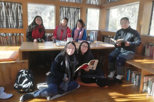 篱苑书屋,由清华大学教授李晓东设计建造,有着“北京最美图书馆 ”的美誉。书屋坐落于怀柔交界河村,外层构造被木棍包裹,内层则是通透、明亮的玻璃,自然清净,与自然风景相得益彰,营造出浓浓的文艺气息。内部陈列着各类书籍,错落的空间结构,让读书变成了一件极富情趣的事情。当阳光透过木条的缝隙照进书屋,暖暖的洒在身上,留下满眼斑驳的倩影,伴着扑面而来的大自然的清香和淡淡书香,老师们一个个或坐、或站,随意的看着书,书屋就这样不经意地被渲染得更加浪漫唯美。