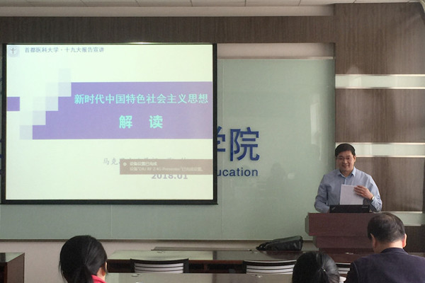 2018年4月18日、20日、25日,学校马克思主义学部张伟副教授为学院部分党员进行了三场题为《新时代中国特色社会主义思想解读》的十九大精神宣讲。张伟副教授将思辨与哲学理论融入到对新时代中国特色社会主义思想的解读当中,从生成逻辑、内容体系和思考评价三方面对新时代中国特色社会主义思想进行了解读。他阐释了新时代中国特色社会主义思想的产生是时代的需要,该思想既是对各阶段社会主义理论的传承,更是现阶段国家领导人对于前人理论思想在新时代的创新。他还从哲学的角度分析了新时代中国特色社会主义思想的基本特点和对于社会发展与个人生存发展的重大指导意义。